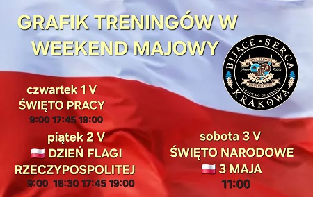 GRAFIK TRENINGÓW W WEEKEND MAJOWY CZWARTEK 1 V - SOBOTA 3 V CZWARTEK 1 V ŚWIĘTO PRACY:9:00 początkujący, średnio zaawansowani17:45 początkujący, średnio zaawansowani19:00 zaawansowani, zawodnicy PIĄTEK 2 V DZIEŃ FLAGI RZECZYPOSPOLITEJ09:00 wszystkie grupy16:30 dzieci i młodzież (7-16 lat)17:45 początkujący, średnio zaawansowani19:00 zaawansowani, zawodnicy SOBOTA 3 V ŚWIĘTO NARODOWE KONSTYTUCJI 3 MAJA11:00 wszystkie grupyOD PONIEDZIAŁKU 5 V TRENINGI ZGODNIE ZE STAŁYM GRAFIKIEM: https://www.facebook.com/share/p/16URLr4zAf/